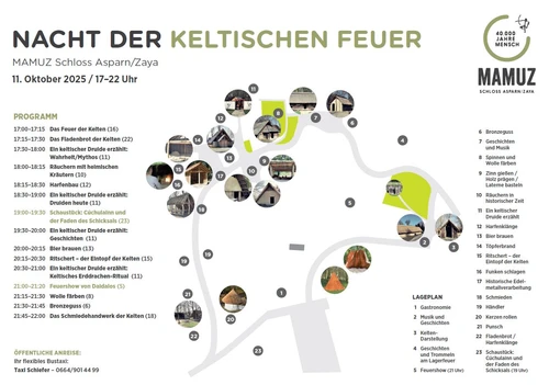 17:00 - 22:00 UhrAm Samstag, 11. Oktober verwandelt sich das archäologische Freigelände des MAMUZ Schloss Asparn/Zaya für eine Nacht in die mystische Welt der Kelten. Gezeigt werden mitreißende Kampfszenen, historisches Handwerk rund ums Feuer sowie Musik und spannende Geschichten, die im Schein der Fackeln von der Eisenzeit, vor 2500 Jahren, in Mitteleuropa erzählen.
