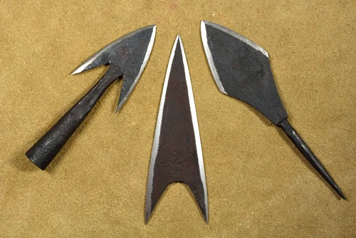 Historischer Hintergrund: In der jüngeren Altsteinzeit waren die Pfeilspitzen der ersten Bogenschützen noch aus Stein gefertigt. Mit fortschreitender technischer Entwicklung steht in unseren Breiten seit ca. 800 v. Chr. der Werkstoff Eisen zur Verfügung, der die Herstellung verschiedenster Pfeilspitzenformen zuließ. Besonders gefürchtet waren die Pfeile der Reitervölker der Völkerwanderungszeit und des Frühmittelalters.